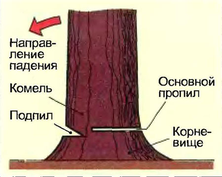 С той стороны, в какую должно падать дерево, мастер бензопилой выпиливает клин. При этом он делает два надреза: один горизонтальный, а второй под углом в 45–600. Глубина этого клиновидного подреза должна быть равна примерно 1/3 диаметра ствола. Чуть ниже первого нижнего пропила мастер делает горизонтальный надрез коры по всей окружности ствола. Это предотвратит задержки во время падения дерева и закручивание ствола вокруг неоторвавшейся полосы коры. Следующий горизонтальный пропил арборист делает со стороны, противоположной клину, немного выше его нижнего запила (на 5–7 см). При этом дровосек не выполняет сквозной зарез, а останавливает движение бензопилы примерно в 2 см от начала клинообразного пропила. |