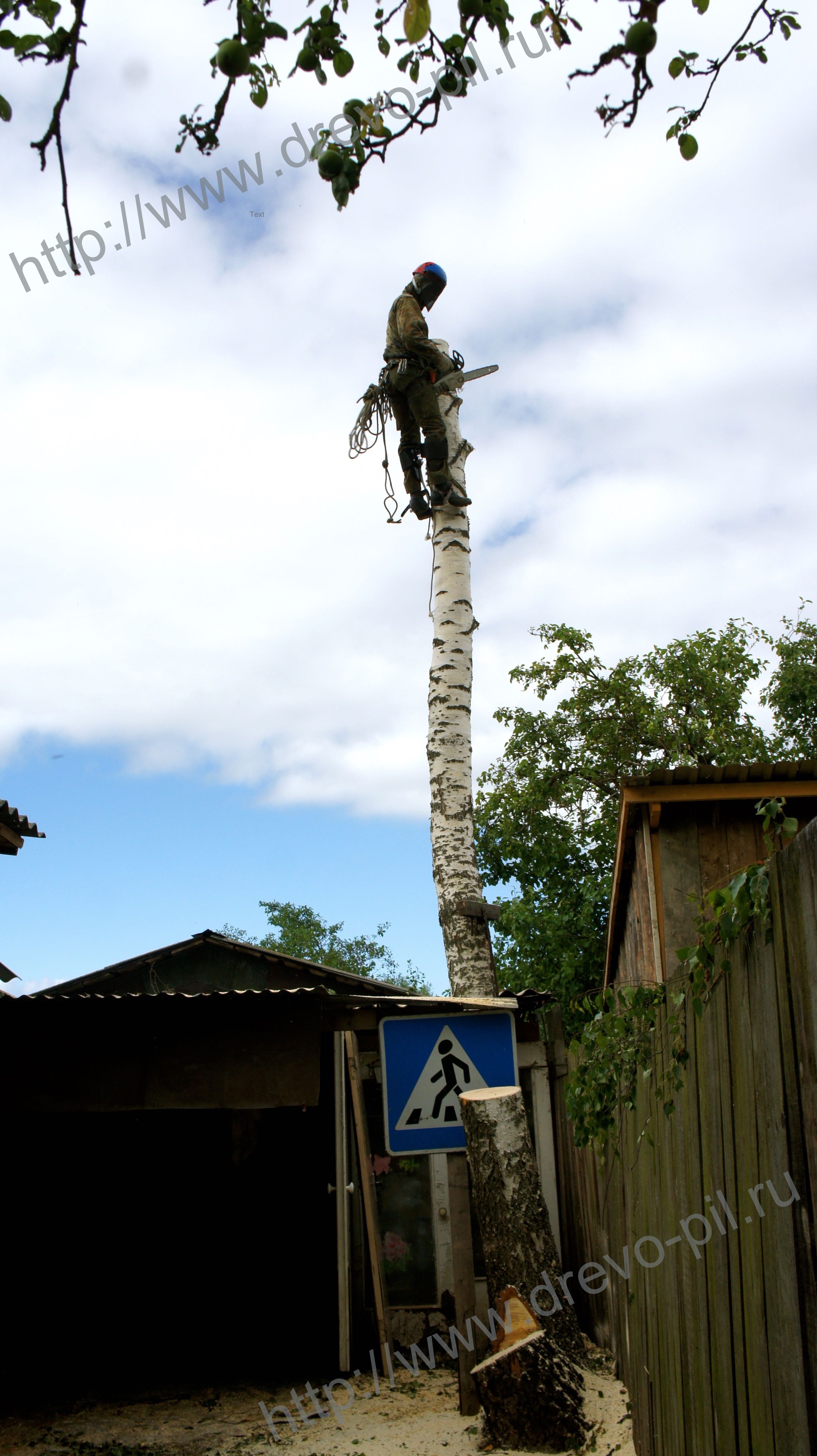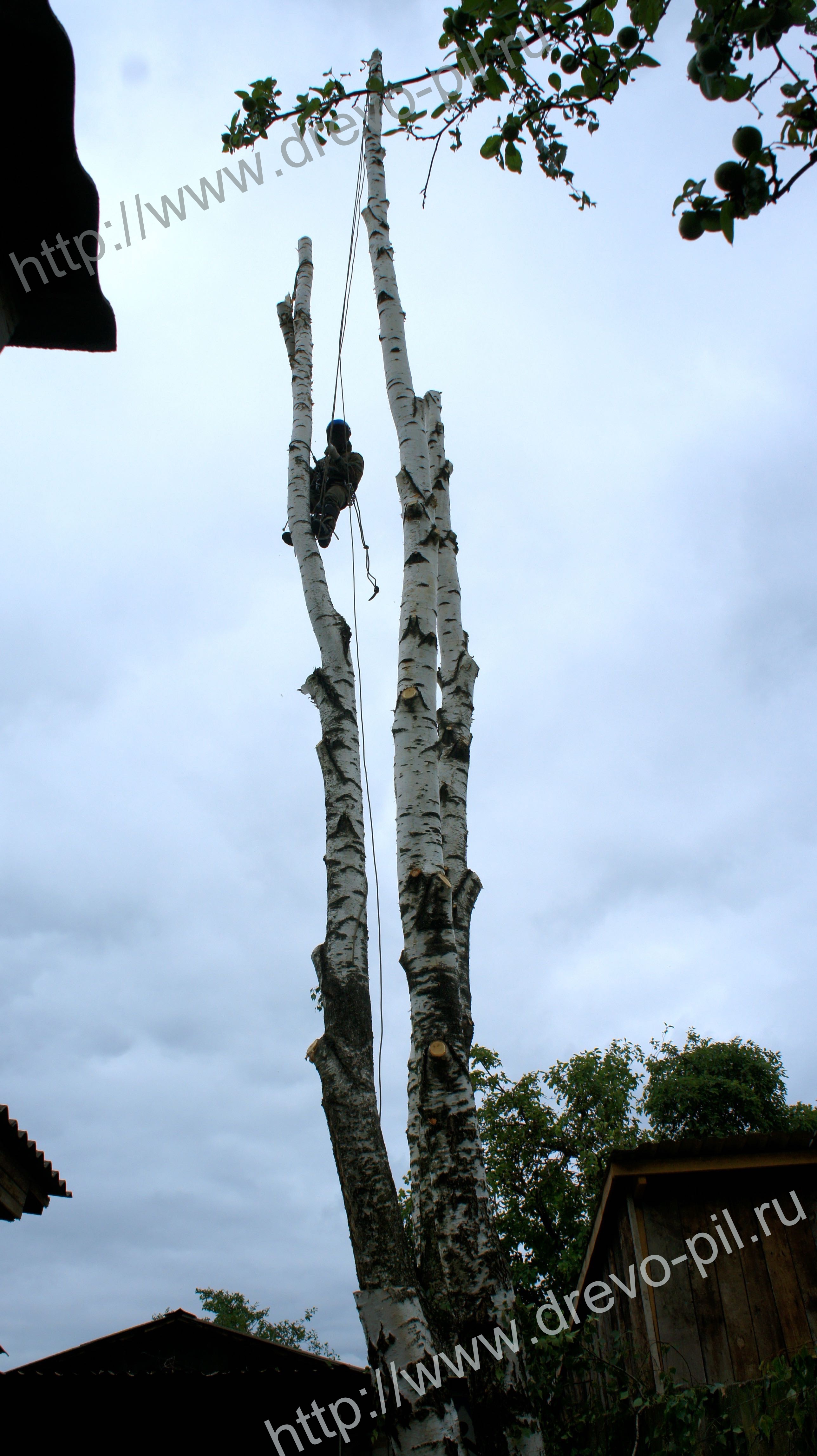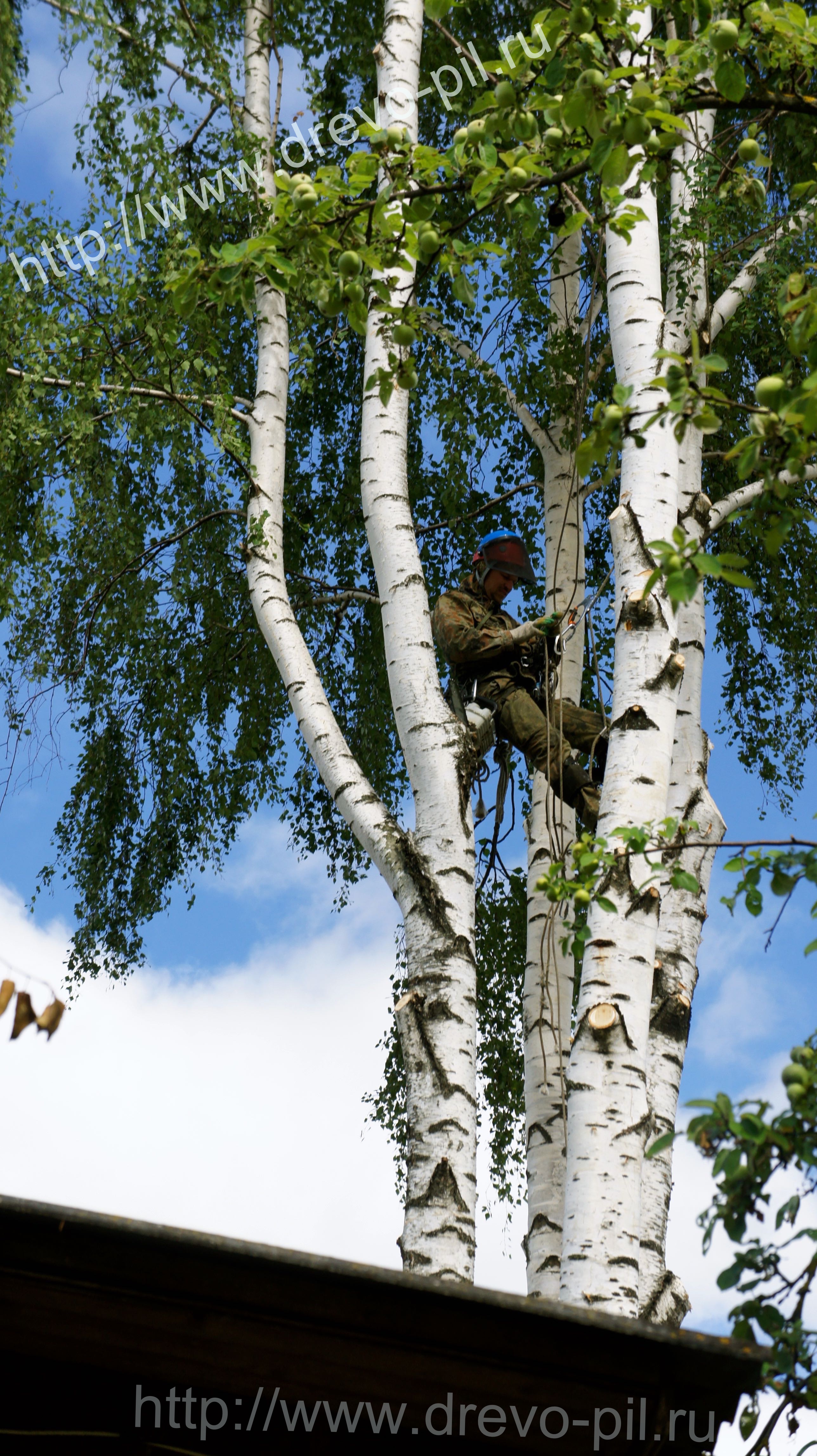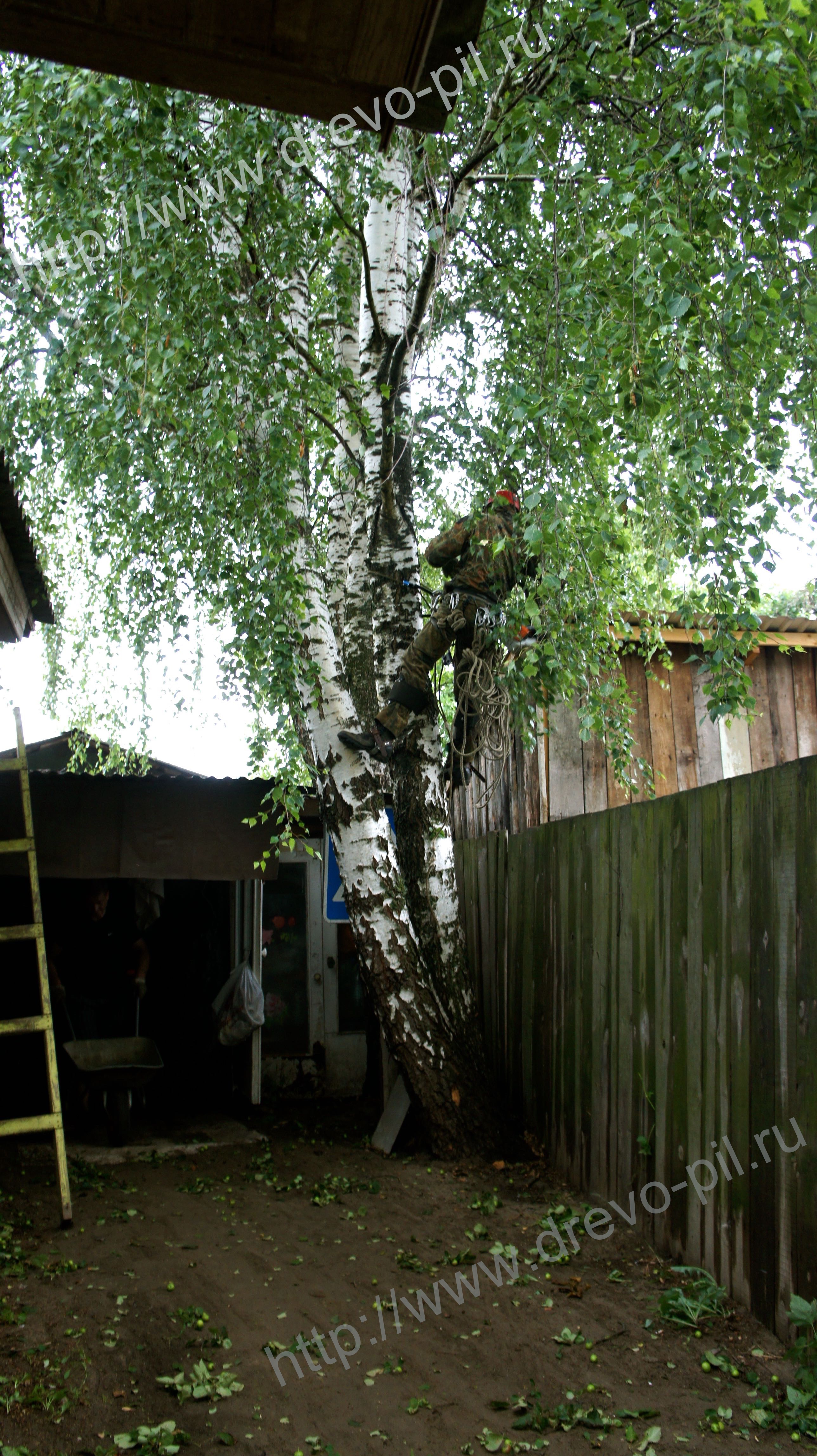 Объем работ: 5 берез, растущие вплотную к забору и гаражу, нависающие над крышей дома. Усложняется тем, что с другой стороны забора постройки соседей.
