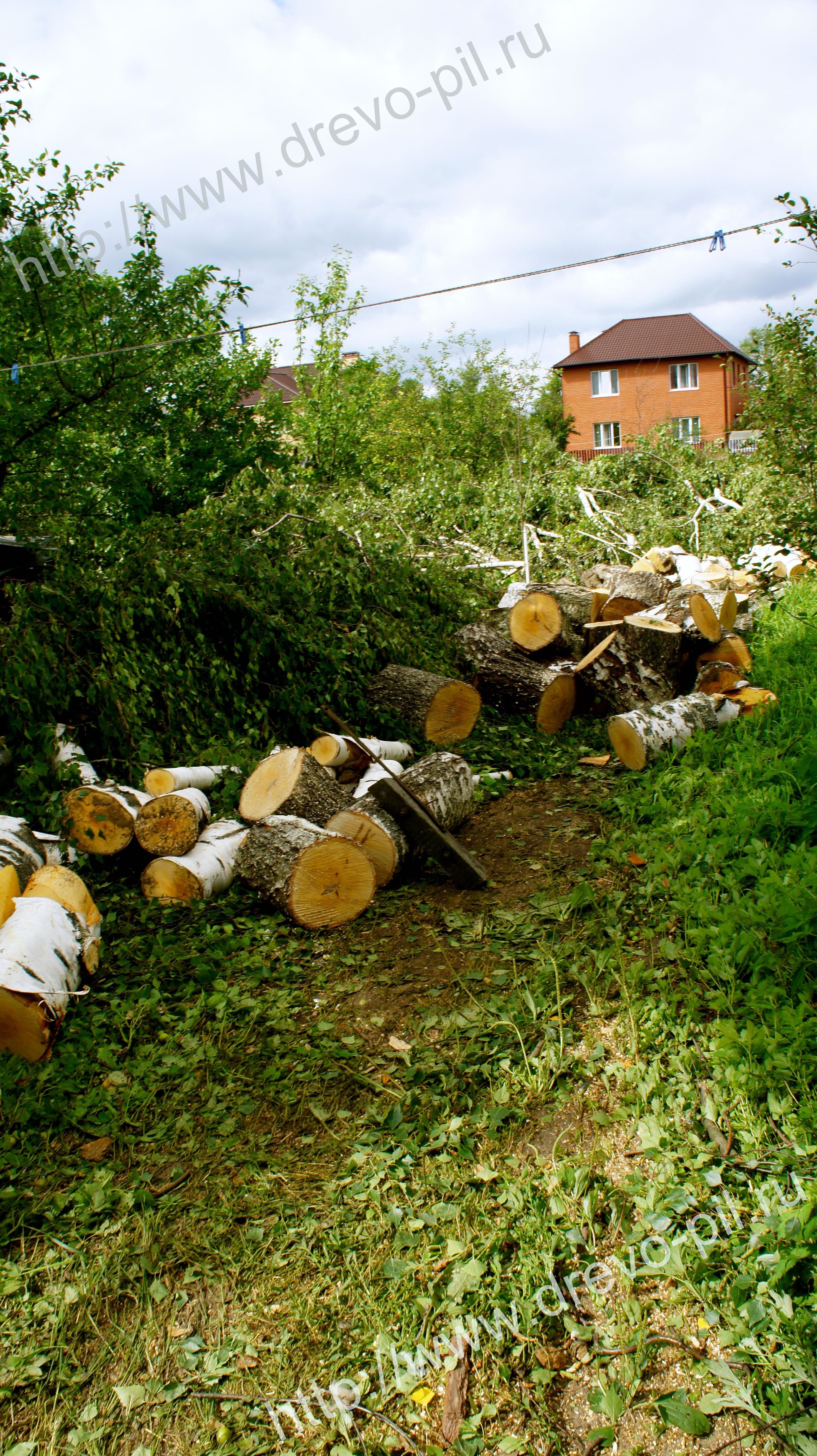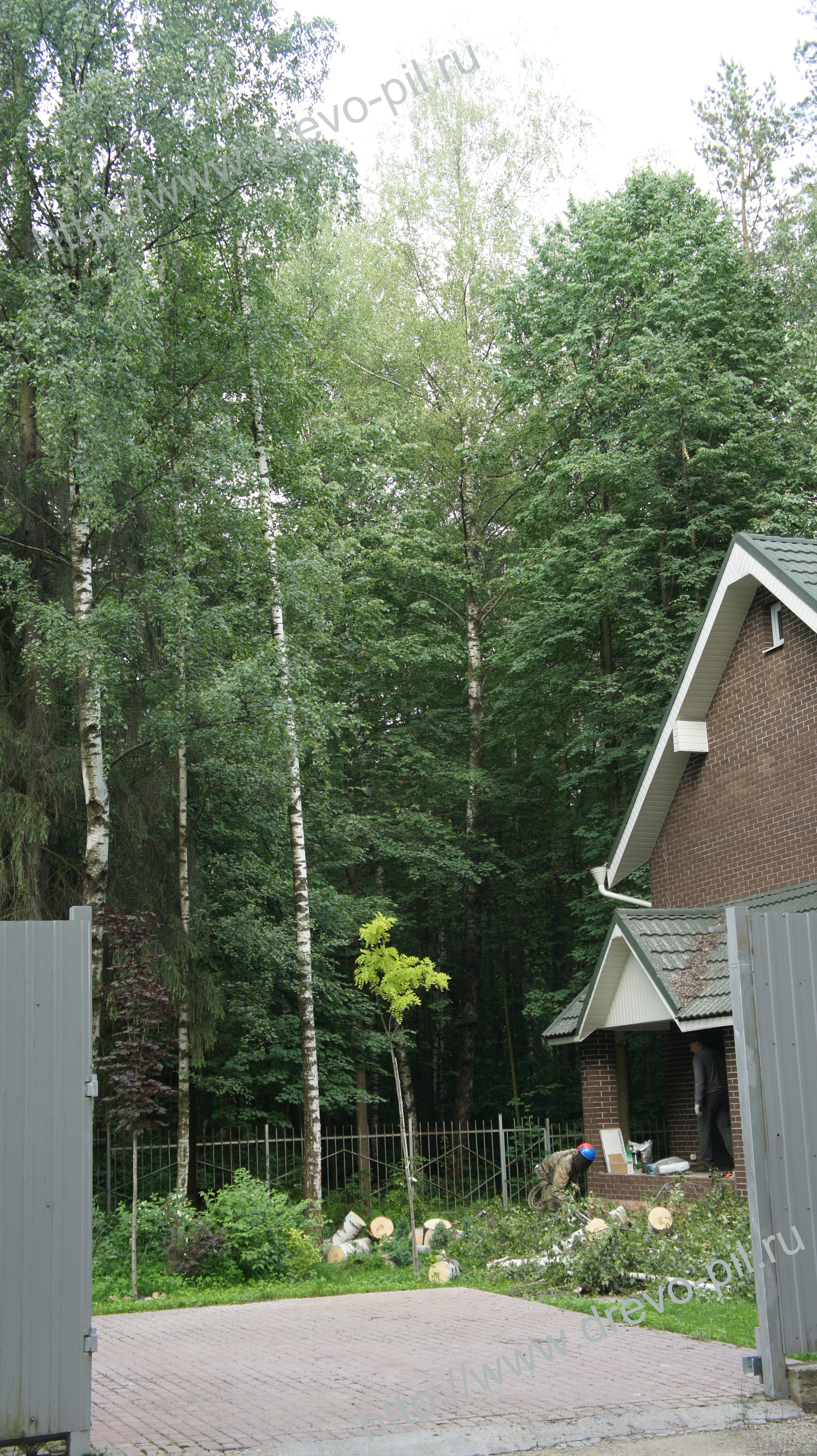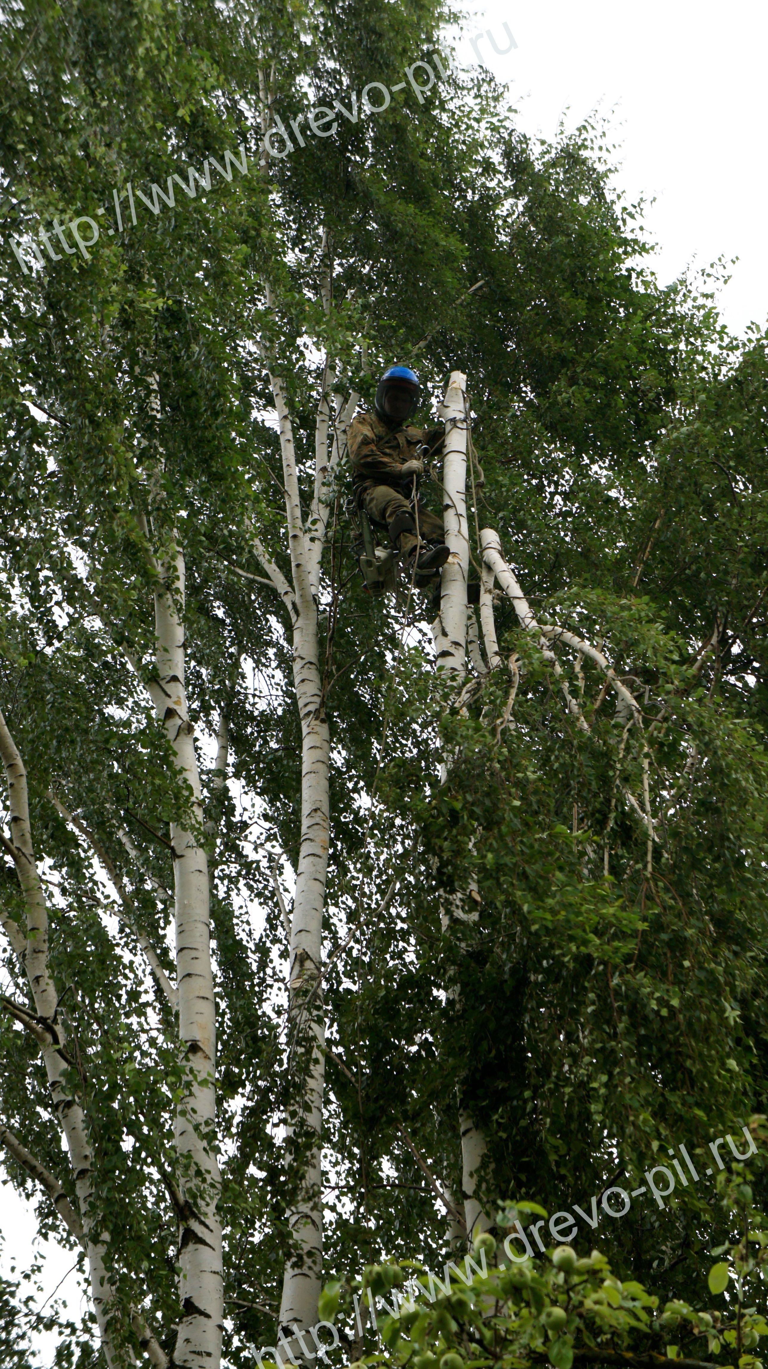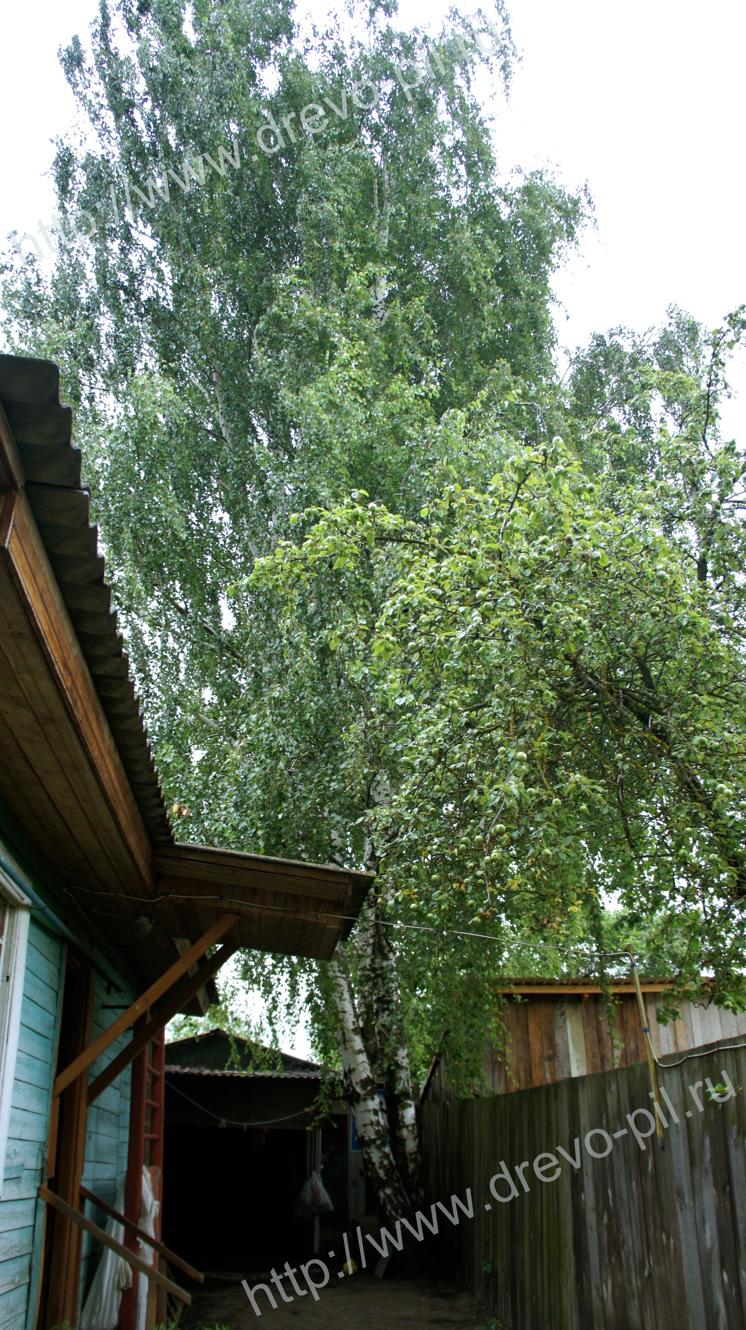 Объем работ: 5 берез, растущие вплотную к забору и гаражу, нависающие над крышей дома. Усложняется тем, что с другой стороны забора постройки соседей.