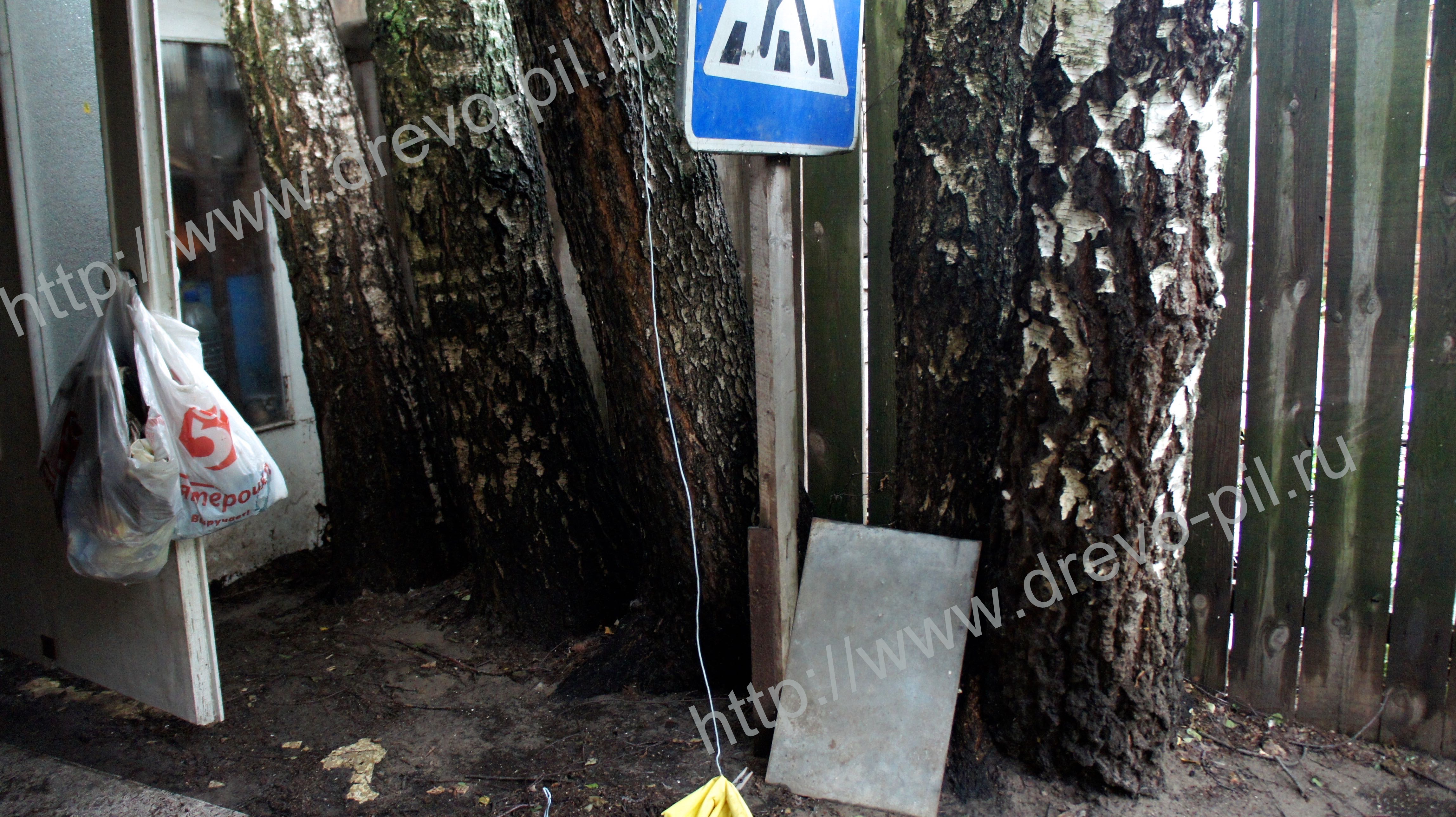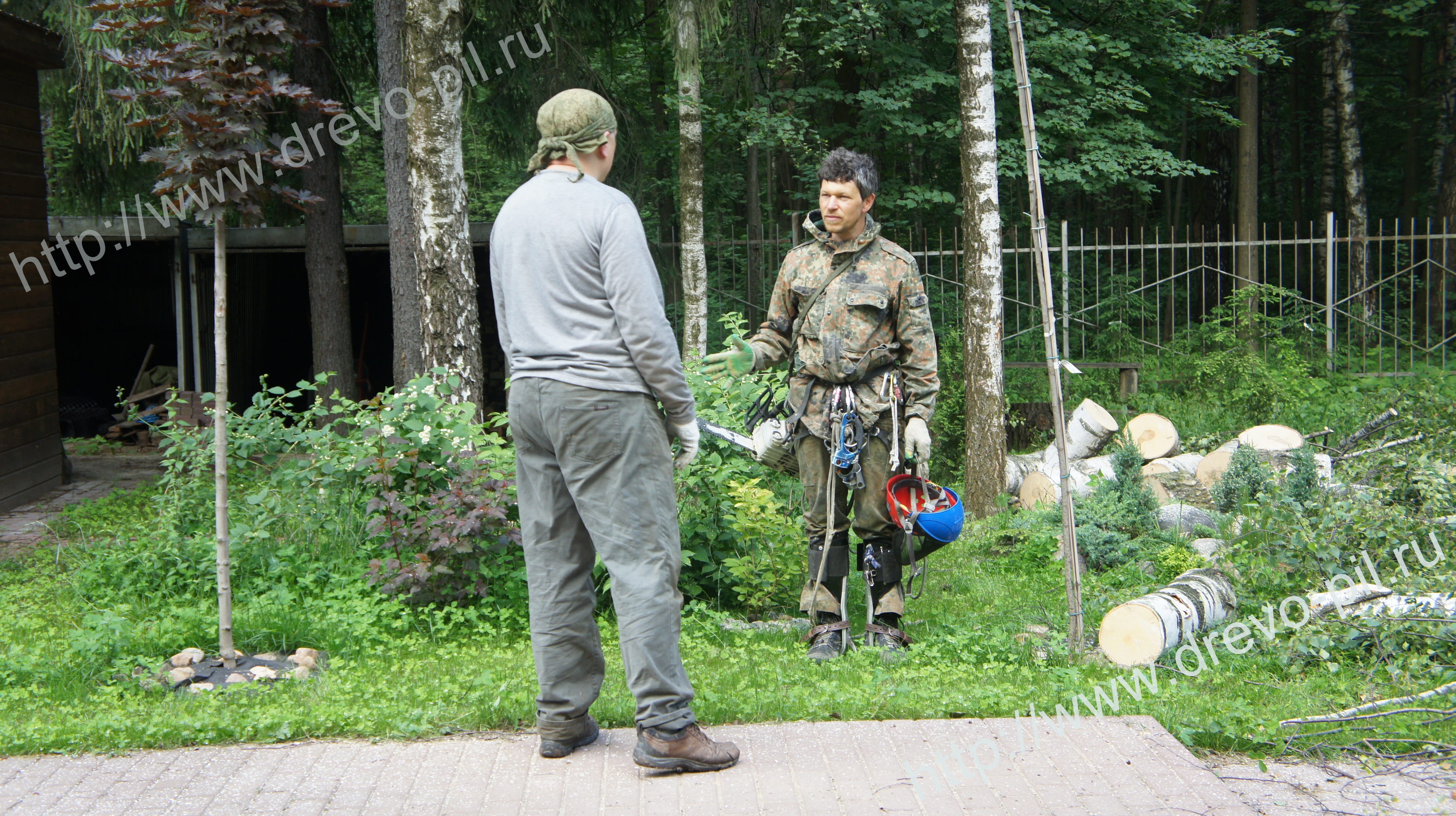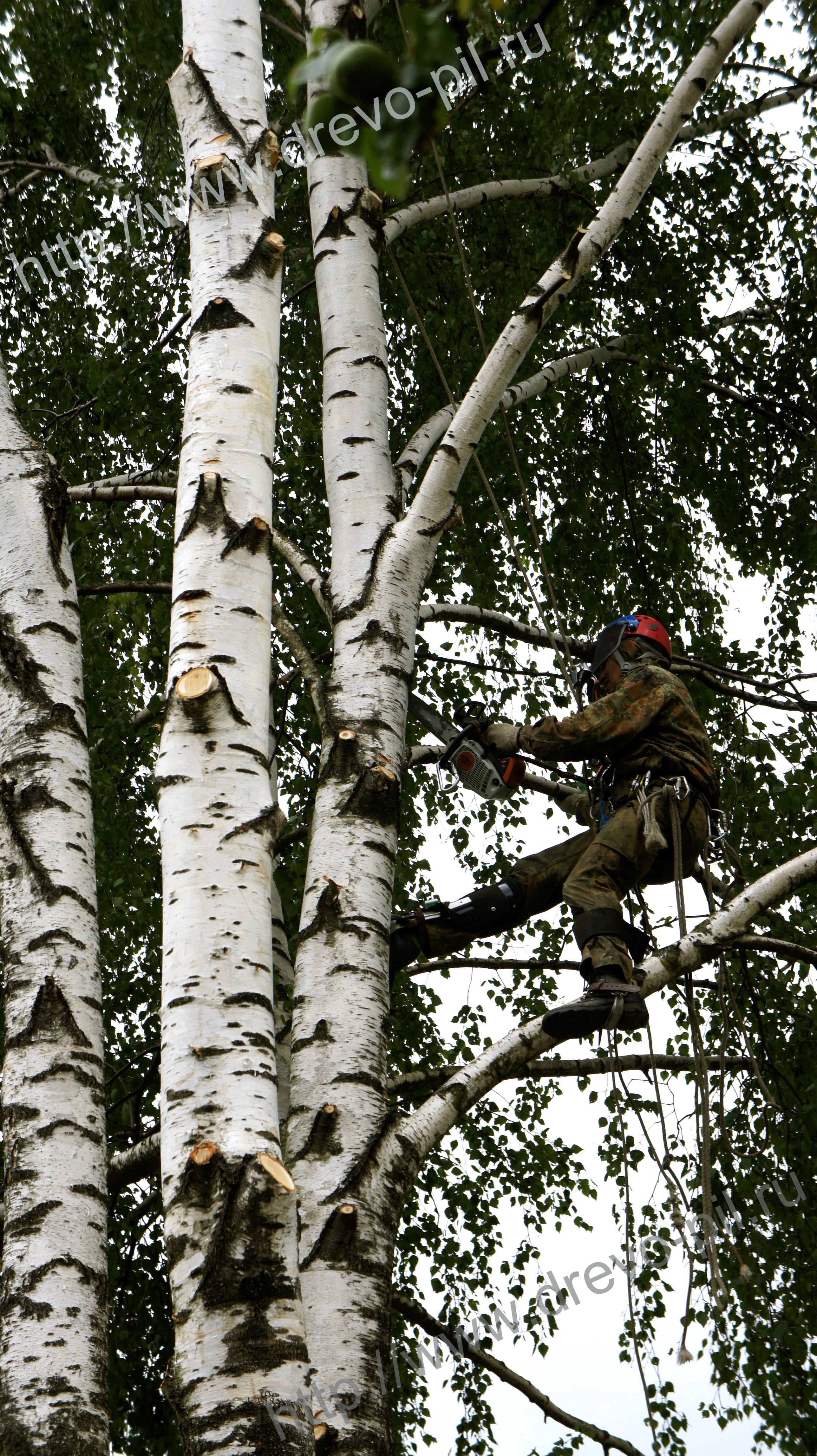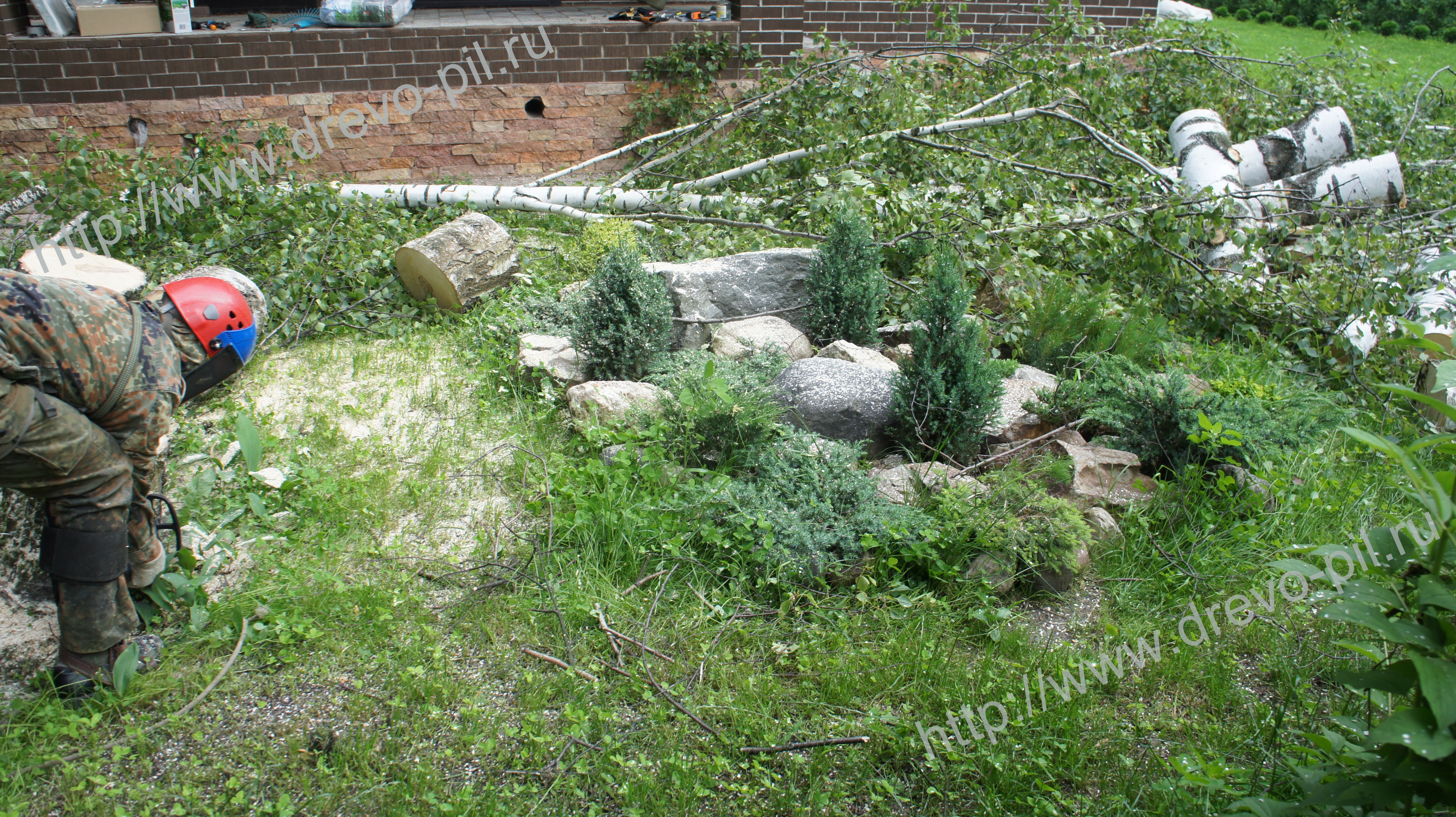 Объем работ: 5 берез, растущие вплотную к забору и гаражу, нависающие над крышей дома. Усложняется тем, что с другой стороны забора постройки соседей.