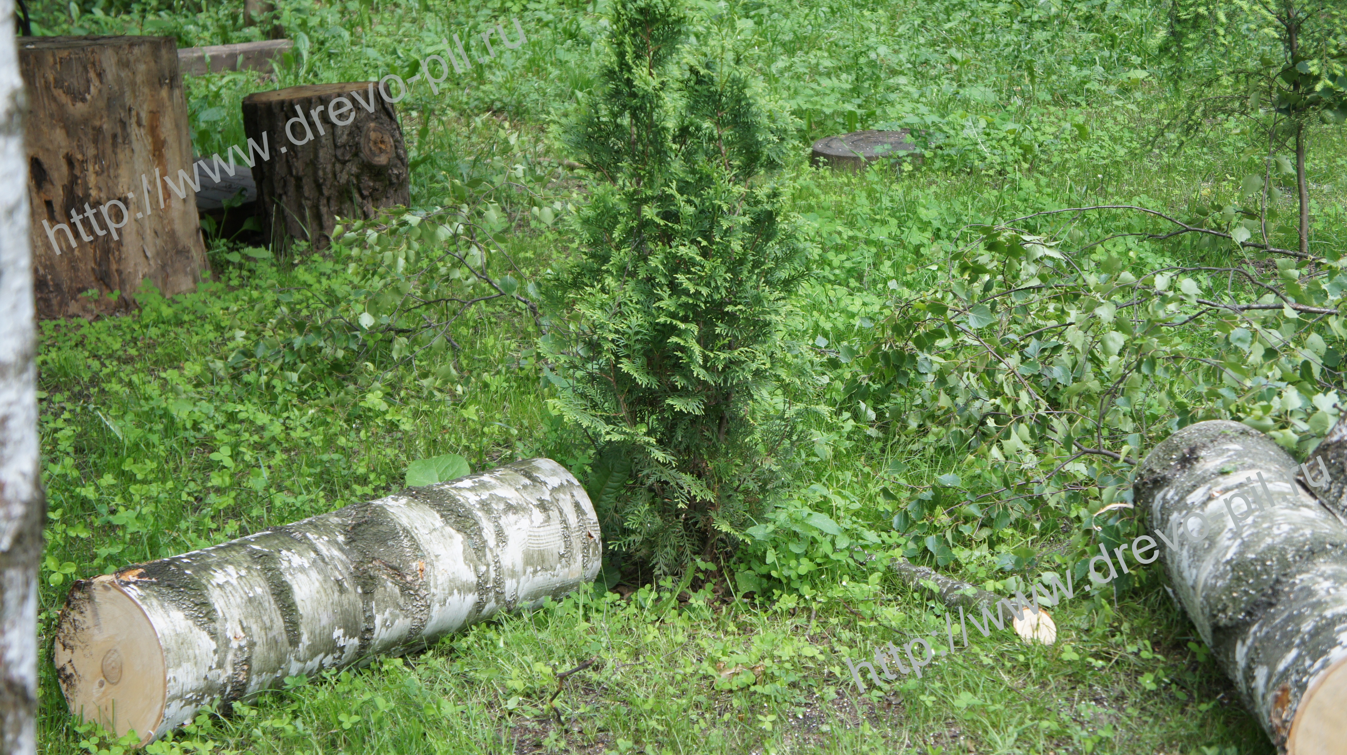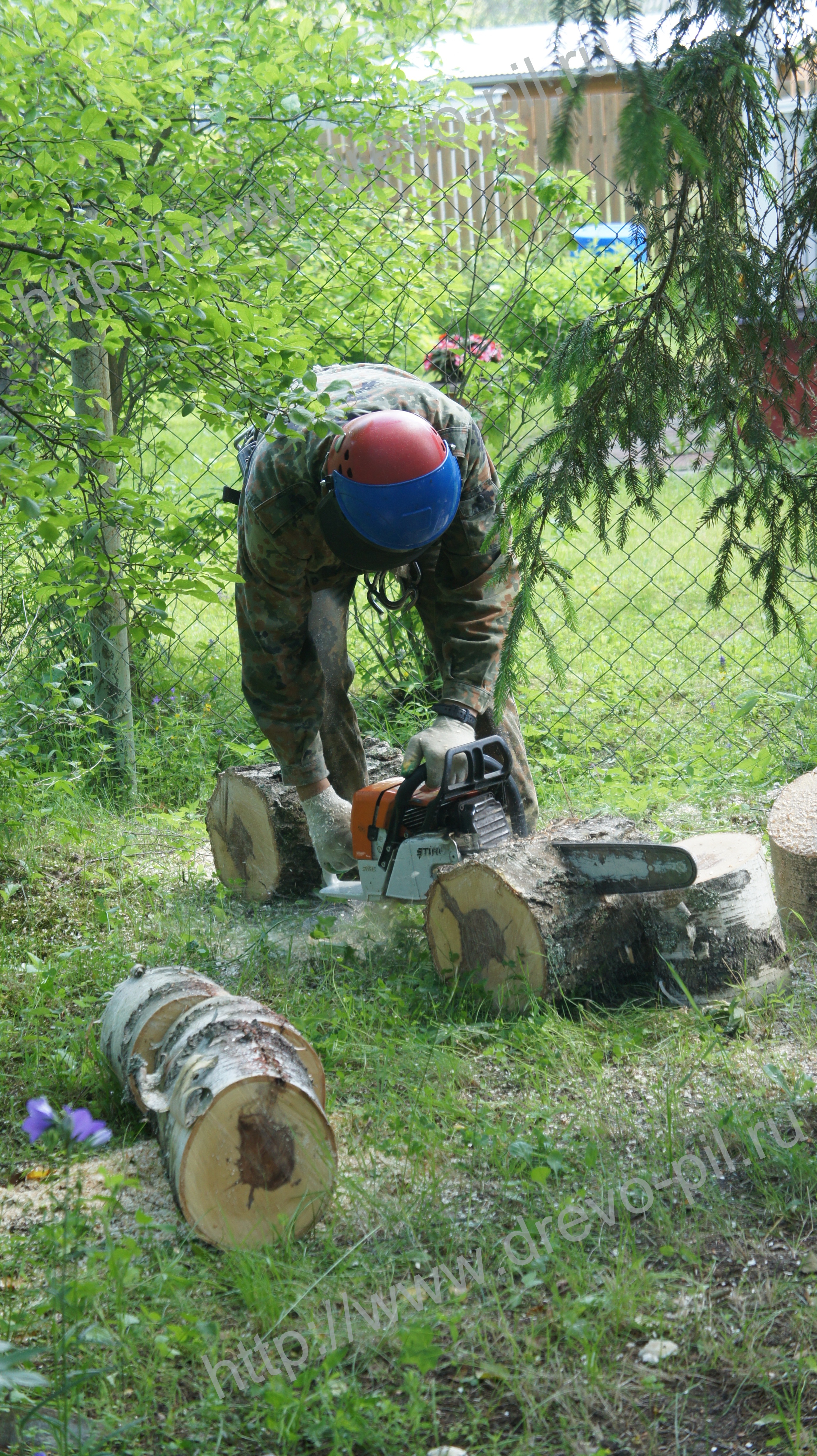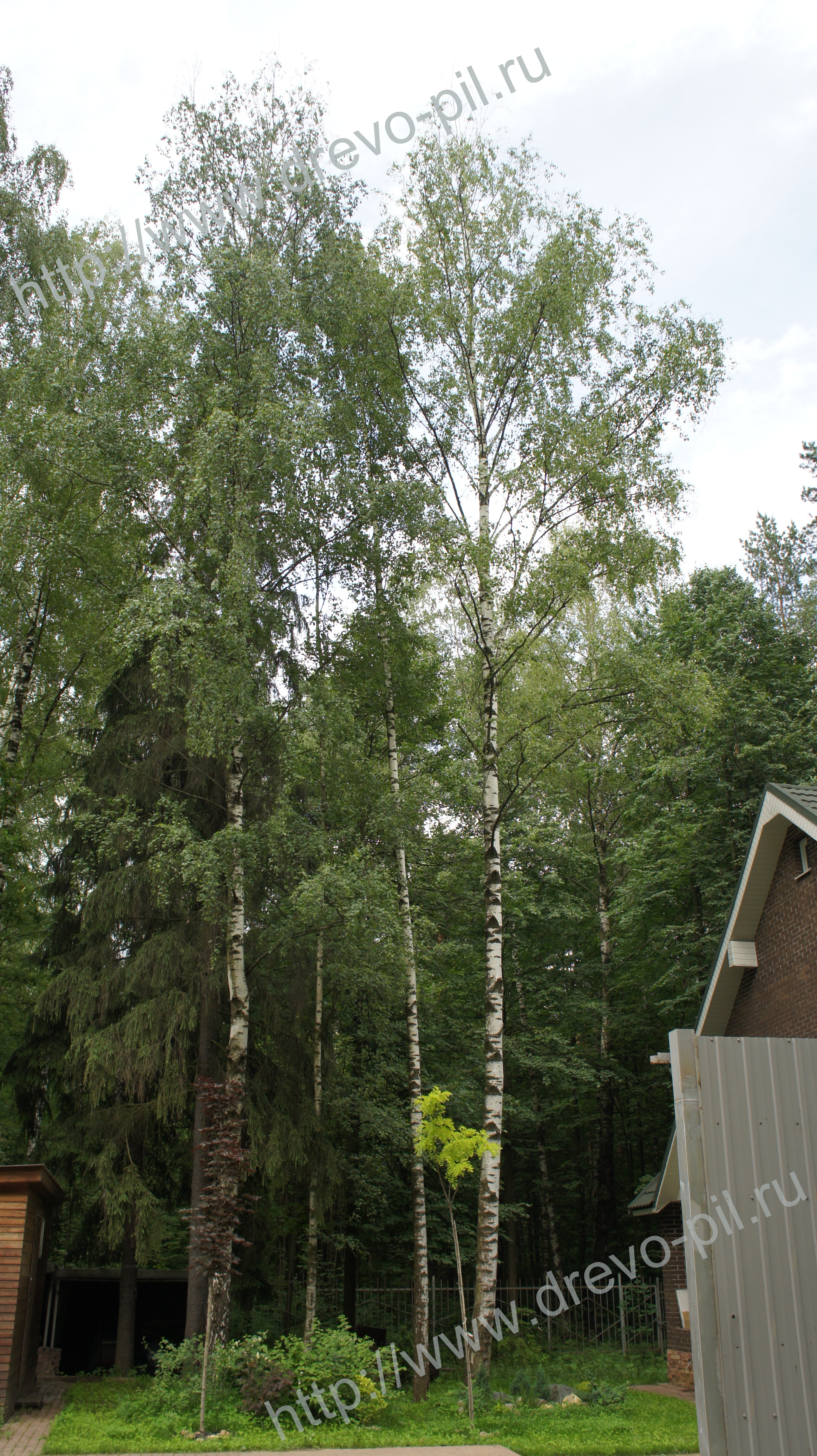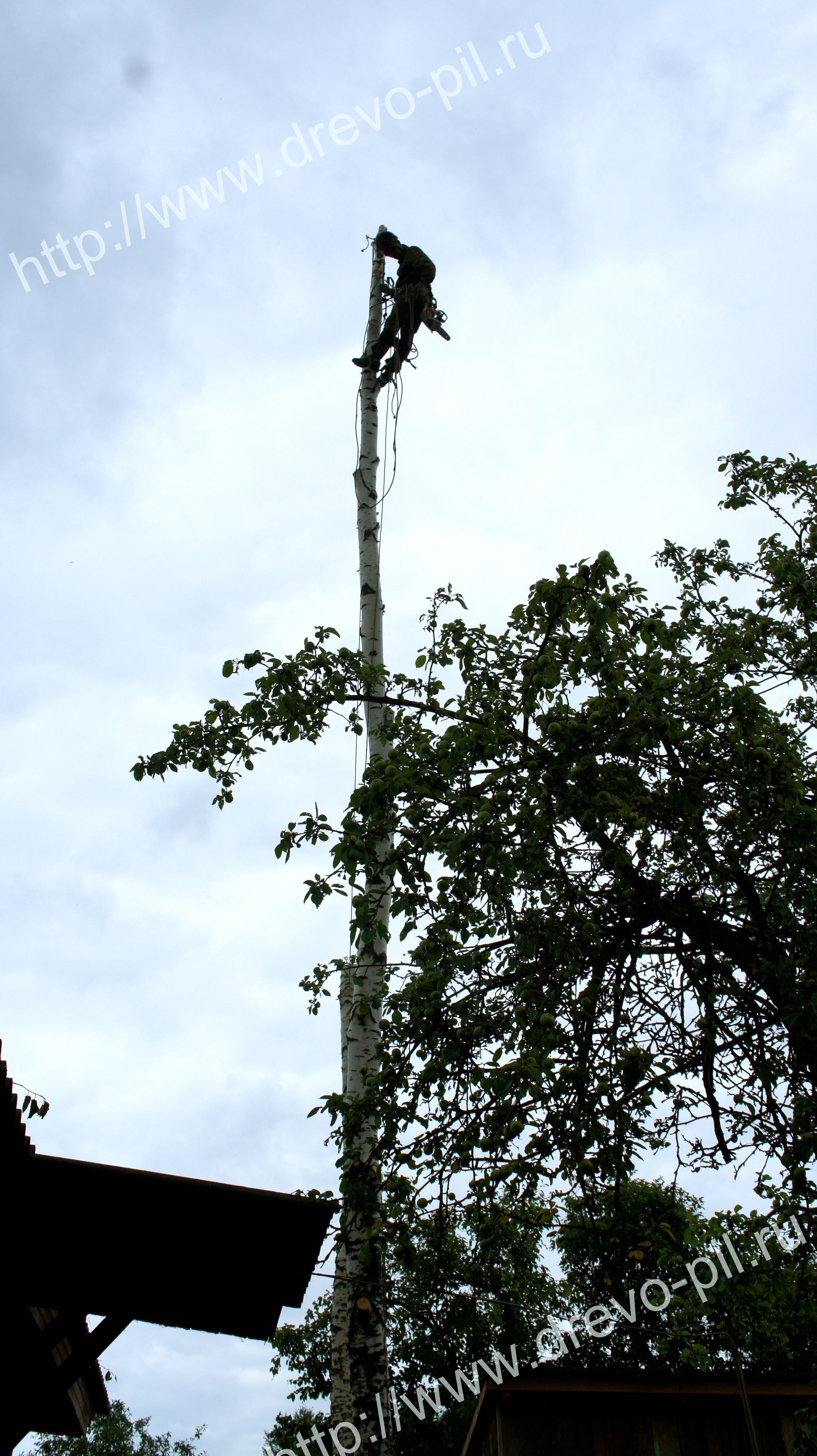 Объем работ: 5 берез, растущие вплотную к забору и гаражу, нависающие над крышей дома. Усложняется тем, что с другой стороны забора постройки соседей.