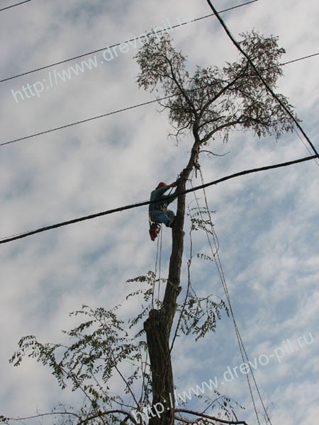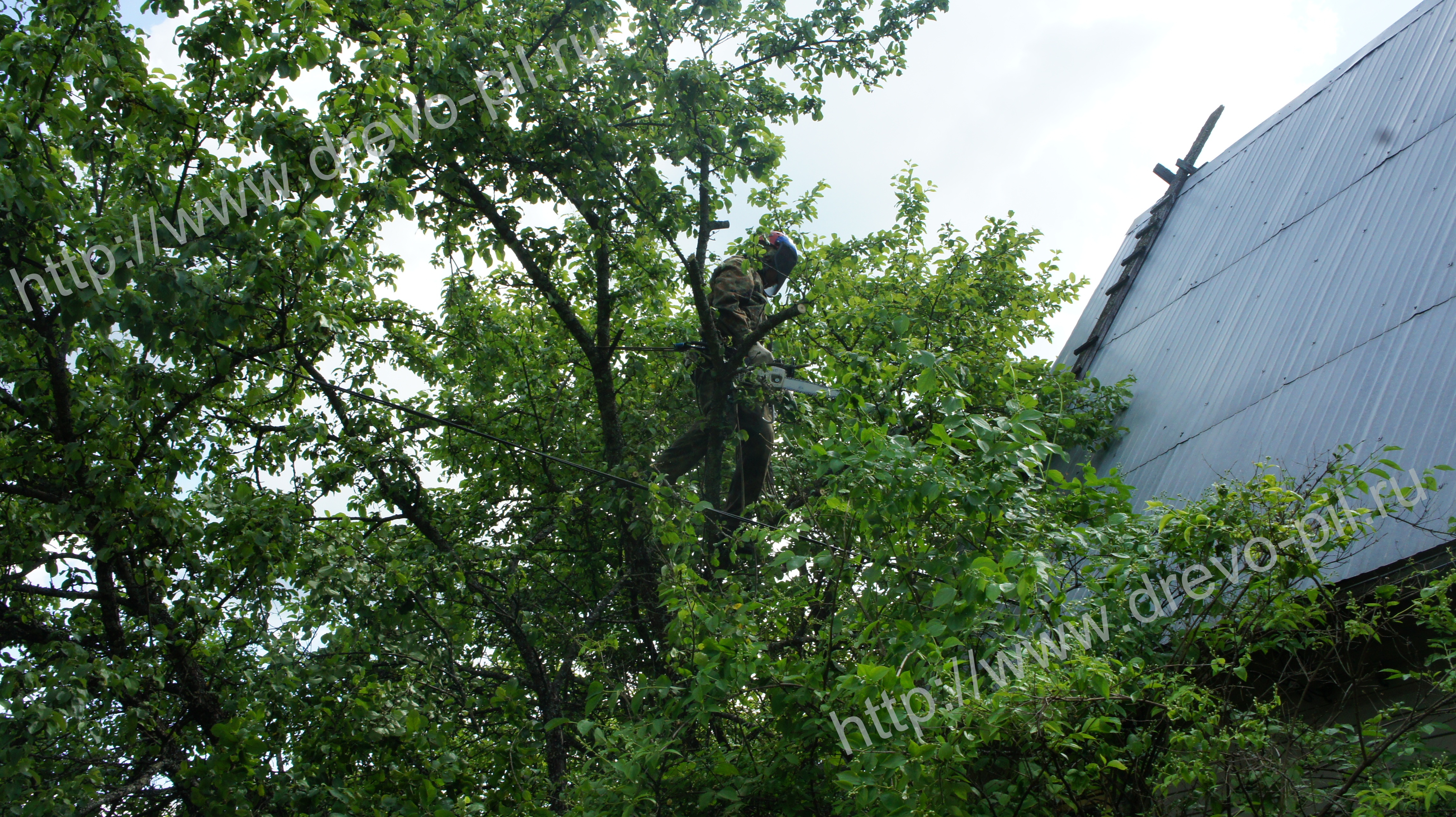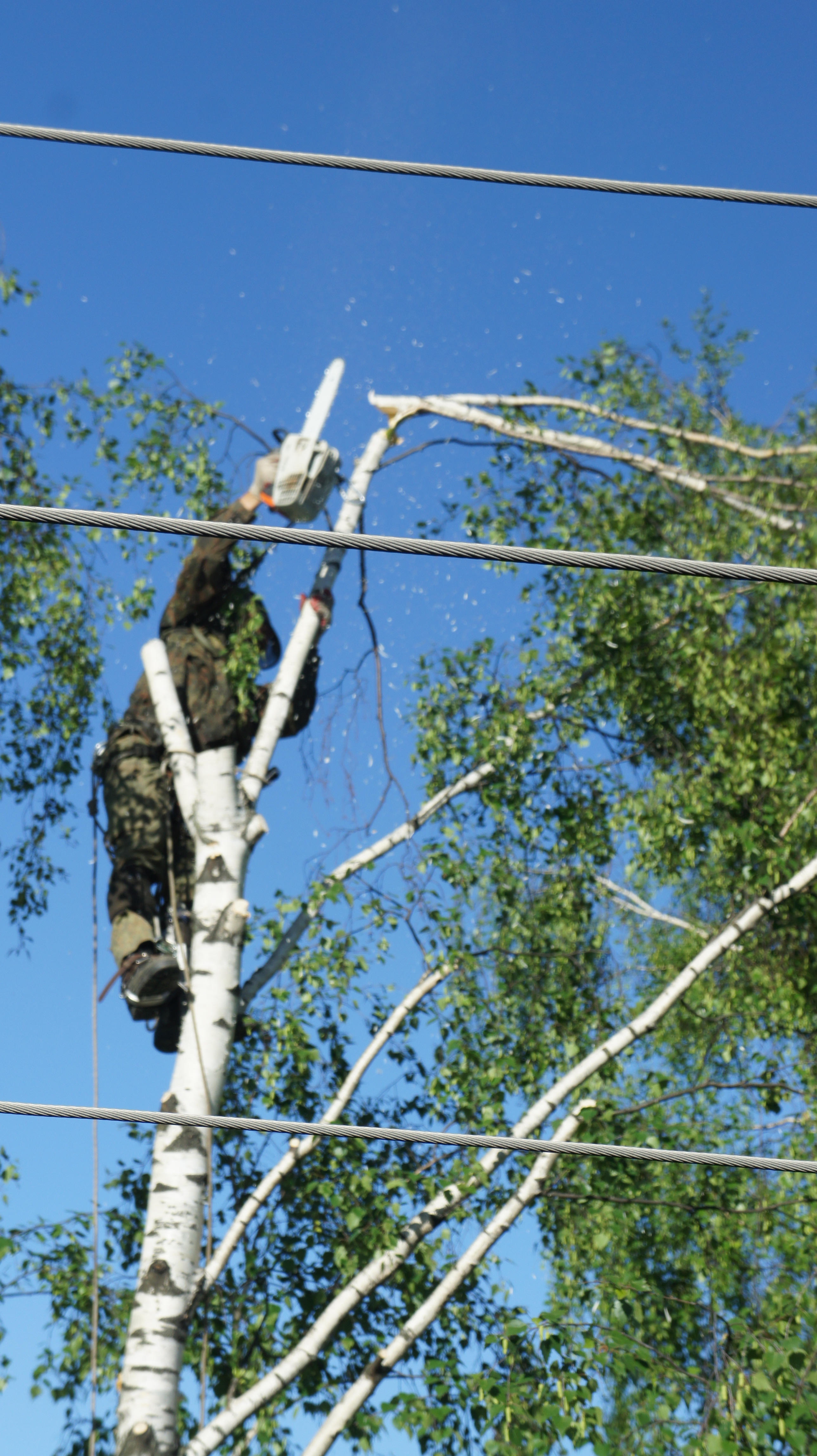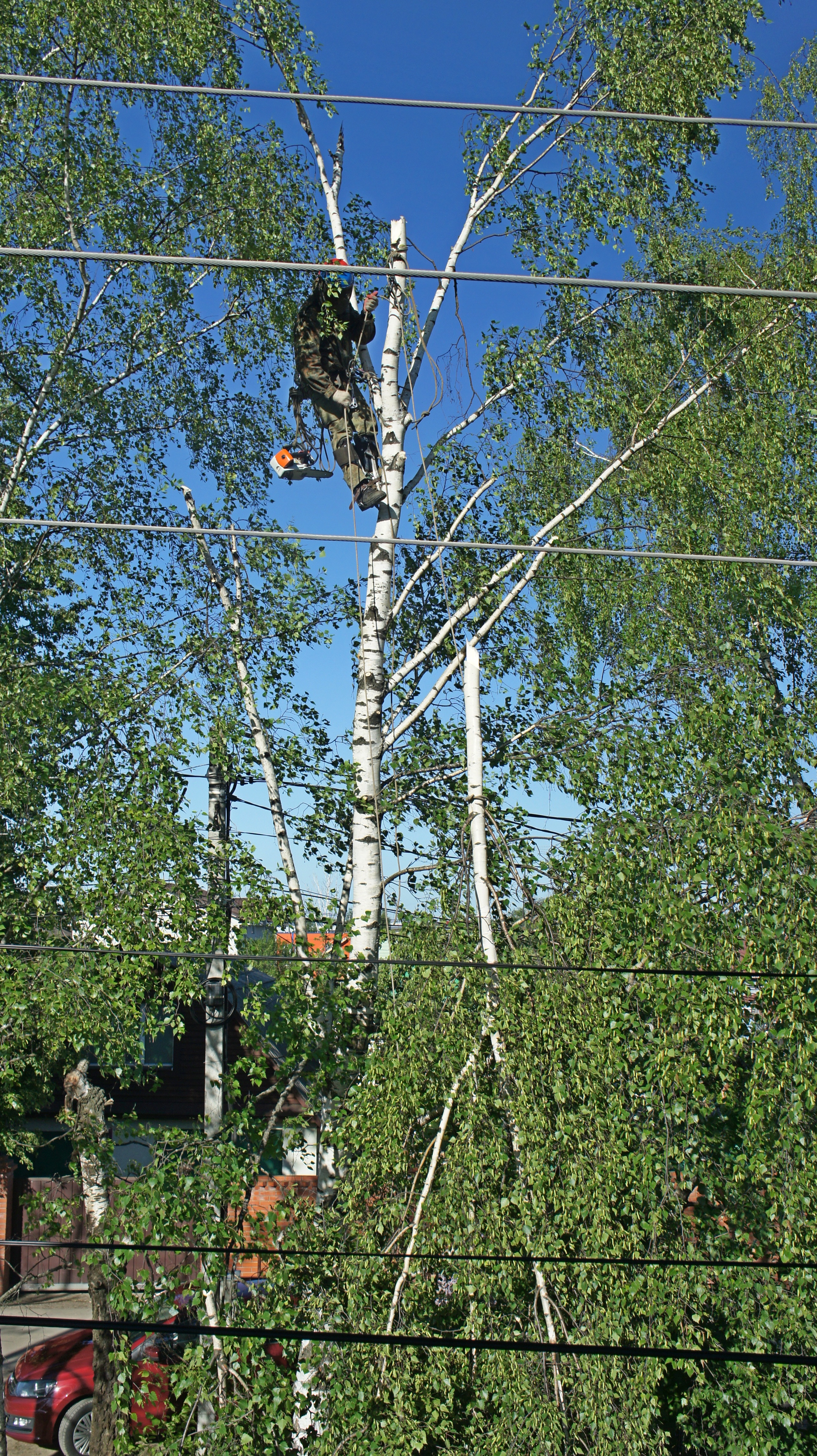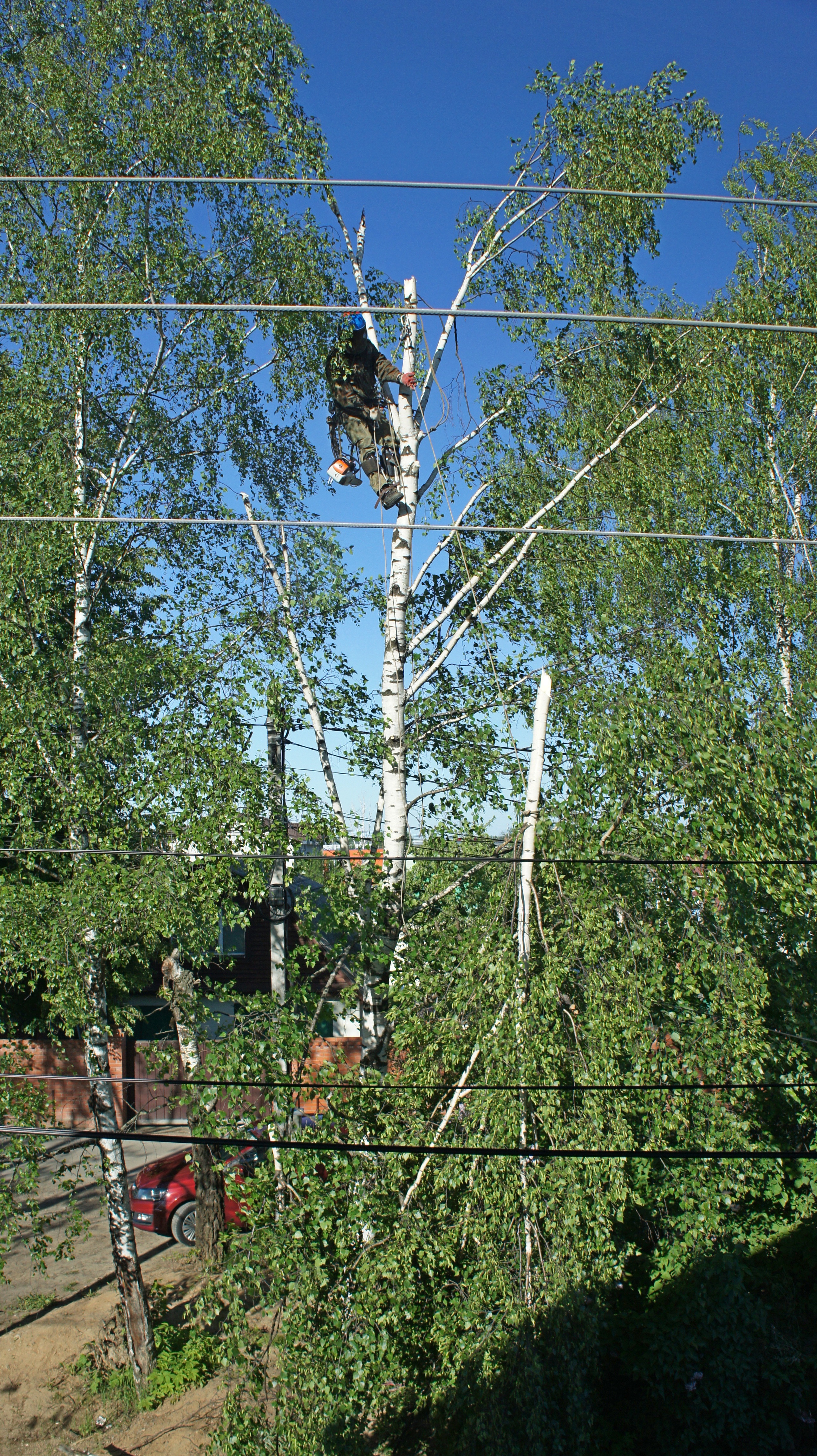 Обрезка деревьев .Провода, машины и крыши остались неповрежденными)